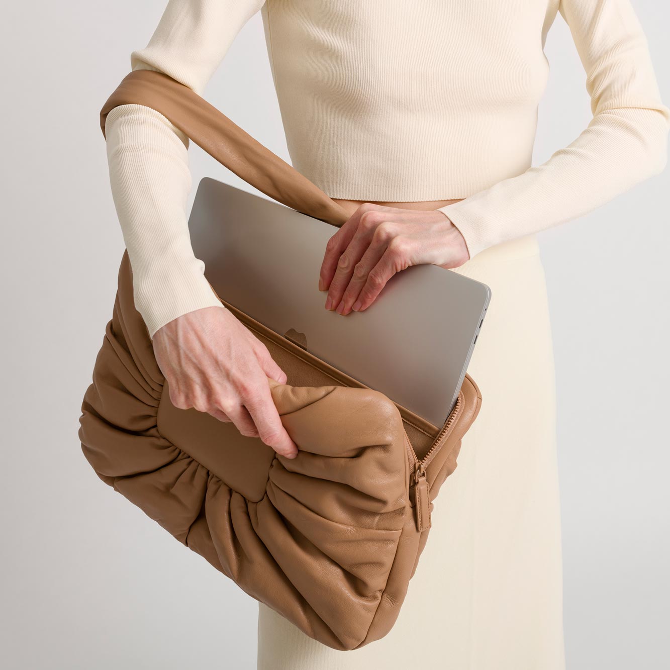 A streamlined approach to daily essentials: The Puff is a super soft and organic clutch designed to hold your laptop and all your office essentials. This lightly padded, soft-as-a-pillow carry-all comes in two sizes: 13” and 16” to fit most laptops.